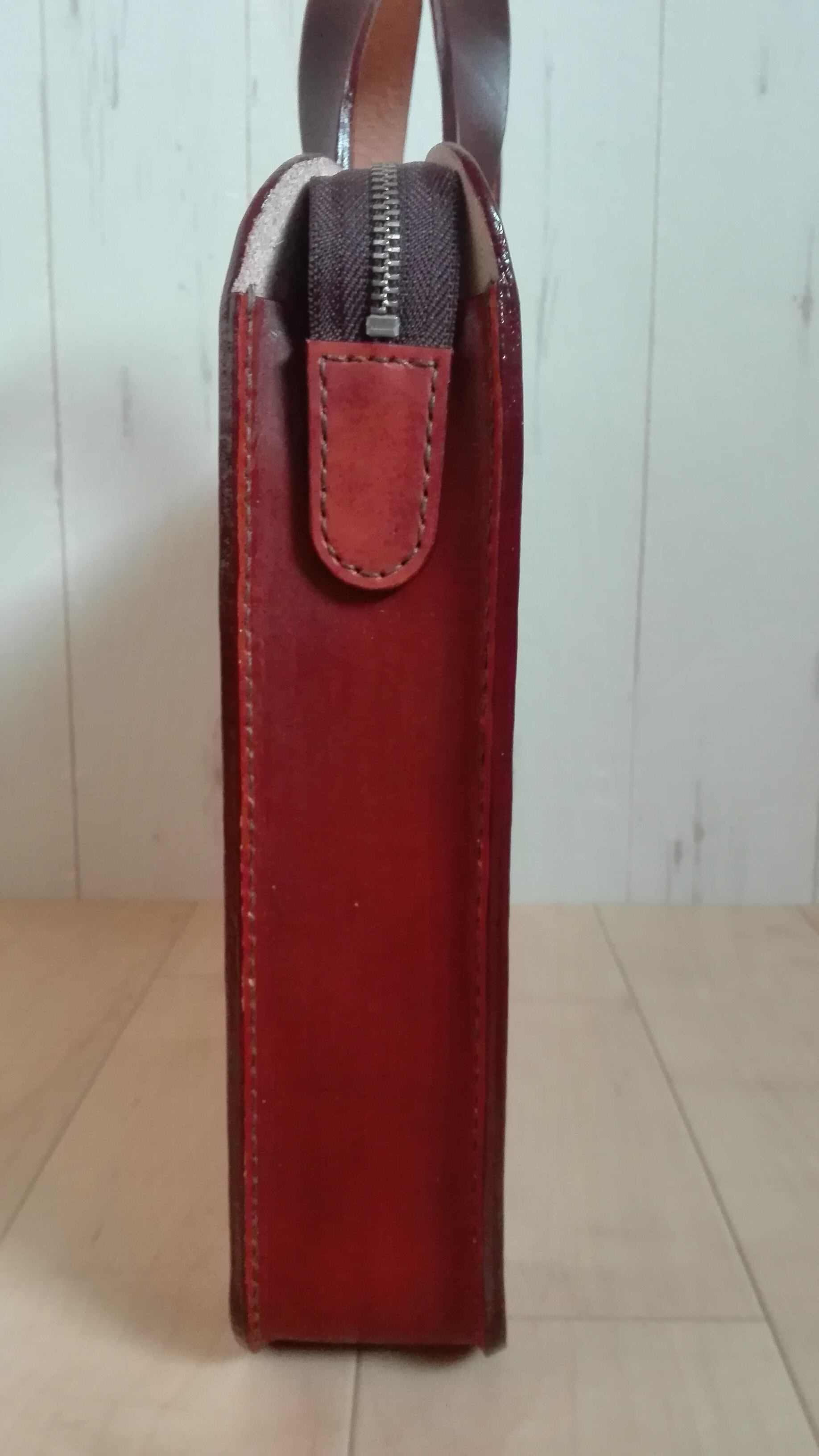 取っ手部分はシンプルかつ丈夫な平革を使い、裏は手触りのよいピッグスキンを使っています。