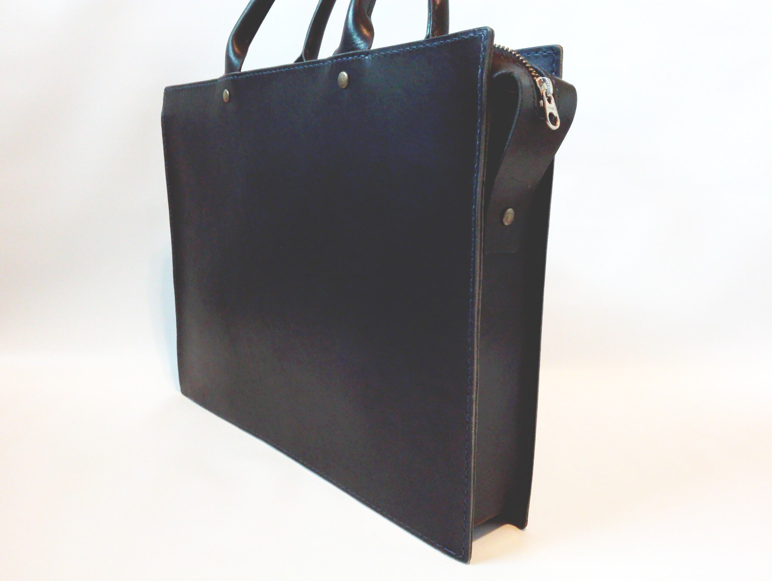 スーツスタイルにぴったりはまる書類バッグのご紹介です。一針一針しっかりと手縫いにて丈夫に仕上げております。ファスナーもYKKの丈夫な物を使用しており、本革の丈夫さと相まって全体的にカッチリとした作りに仕上がりました。四角いフォルムに中身がなくても自立する一見無骨でパリッとした印象ですが、ハンドメイド特有の温かみのある雰囲気がどことなくホッとさせてくれる、そんなバッグです。